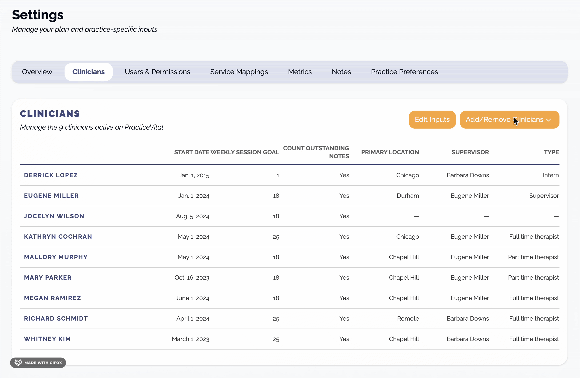 PracticeVital will automatically detect changes in your staff based on your EHR activity, and you can manually add or remove specific clinicians directly within Settings > Clinicians. Simply click the yellow button in the top right to "Add/Remove Clinicians." Review your list of potential clinicians to include and mark them as either Active or Inactive in PracticeVital. Be sure to save your changes before exiting this page.